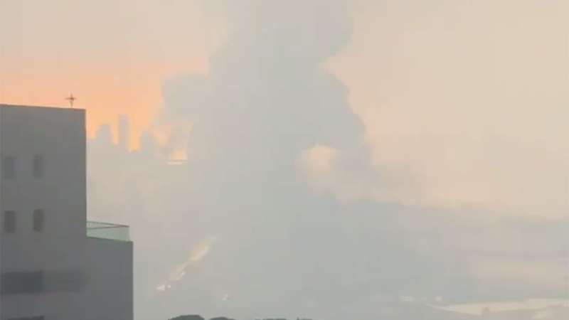 Initially, video taken by residents showed a fire raging at the port, sending up a giant column of smoke, illuminated by flashes of what appeared to be fireworks. Local TV stations reported that a fireworks warehouse was involved. The fire then appeared to spread to a nearby building, triggering a more massive explosion, sending up a mushroom cloud and generating a shock wave.
