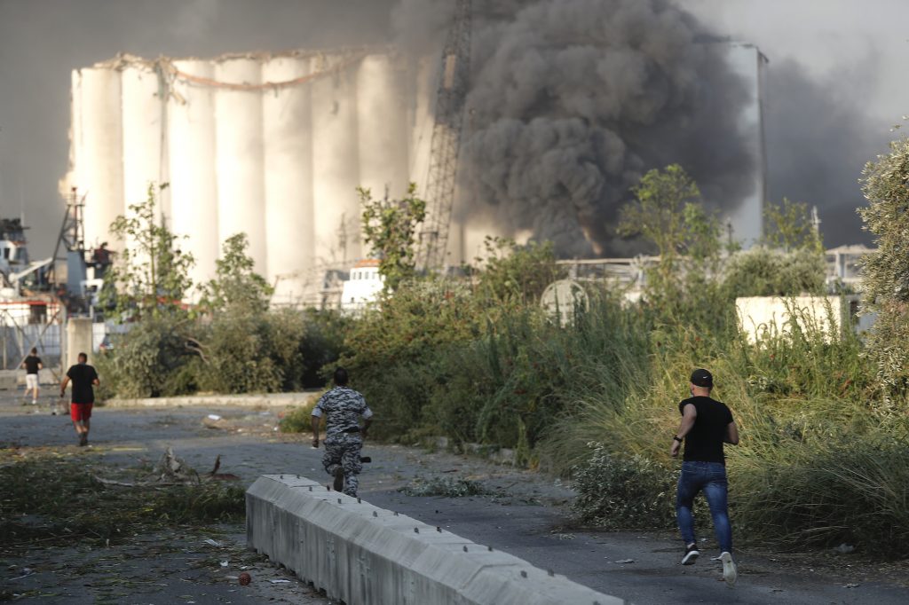 Lebanese security officers run to the explosion scene that hit the seaport, in Beirut Lebanon, Tuesday, Aug. 4, 2020. Massive explosions rocked downtown Beirut on Tuesday, flattening much of the port, damaging buildings and blowing out windows and doors as a giant mushroom cloud rose above the capital. Witnesses saw many people injured by flying glass and debris. (AP Photo/Hussein Malla)