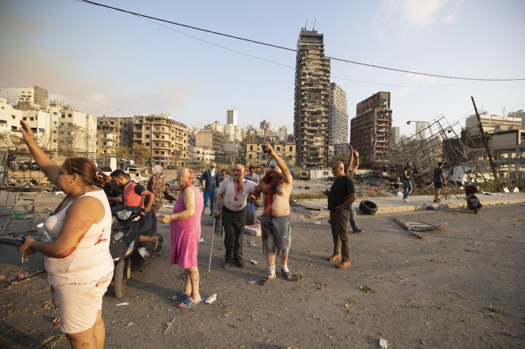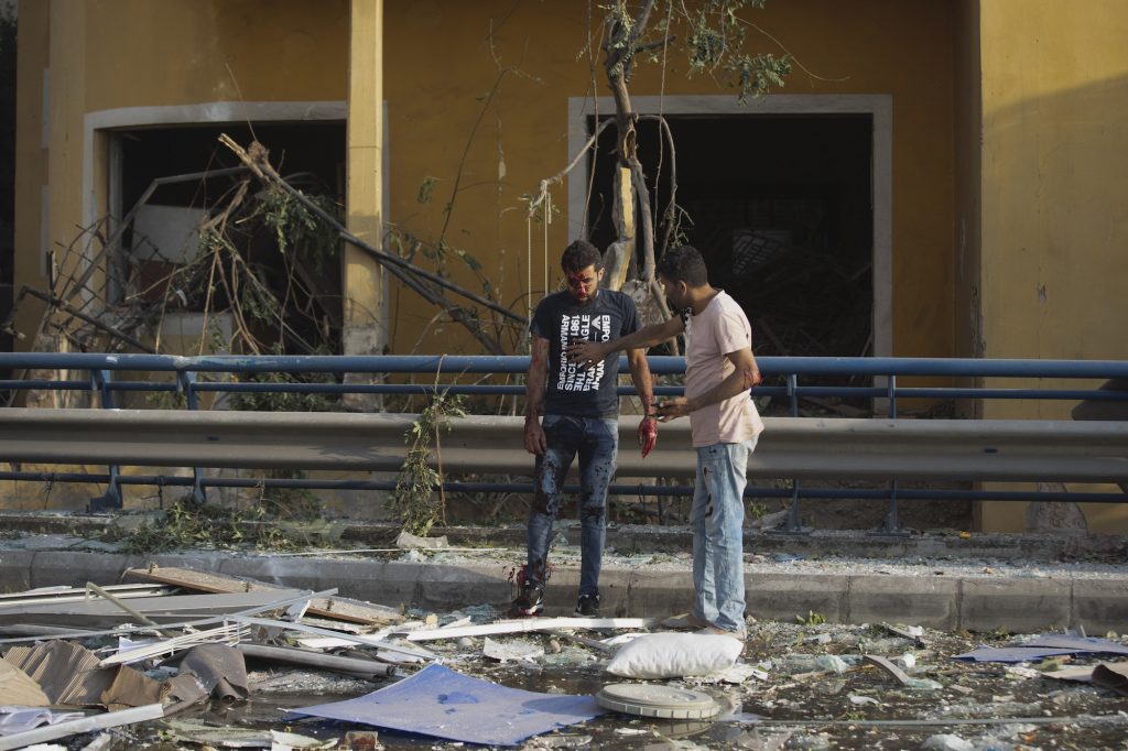 Injured people stand after a massive explosion in Beirut, Lebanon, Tuesday, Aug. 4, 2020. Massive explosions rocked downtown Beirut on Tuesday, flattening much of the port, damaging buildings and blowing out windows and doors as a giant mushroom cloud rose above the capital. Witnesses saw many people injured by flying glass and debris. (AP Photo/Hassan Ammar)