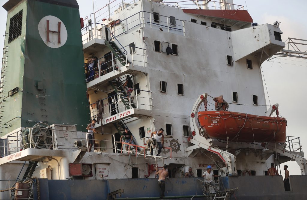 Sailors evacuate their damaged ship which dock near the explosion scene that hit the seaport of Beirut, Lebanon, Tuesday, Aug. 4, 2020. Massive explosions rocked downtown Beirut on Tuesday, flattening much of the port, damaging buildings and blowing out windows and doors as a giant mushroom cloud rose above the capital. (AP Photo/Hussein Malla)